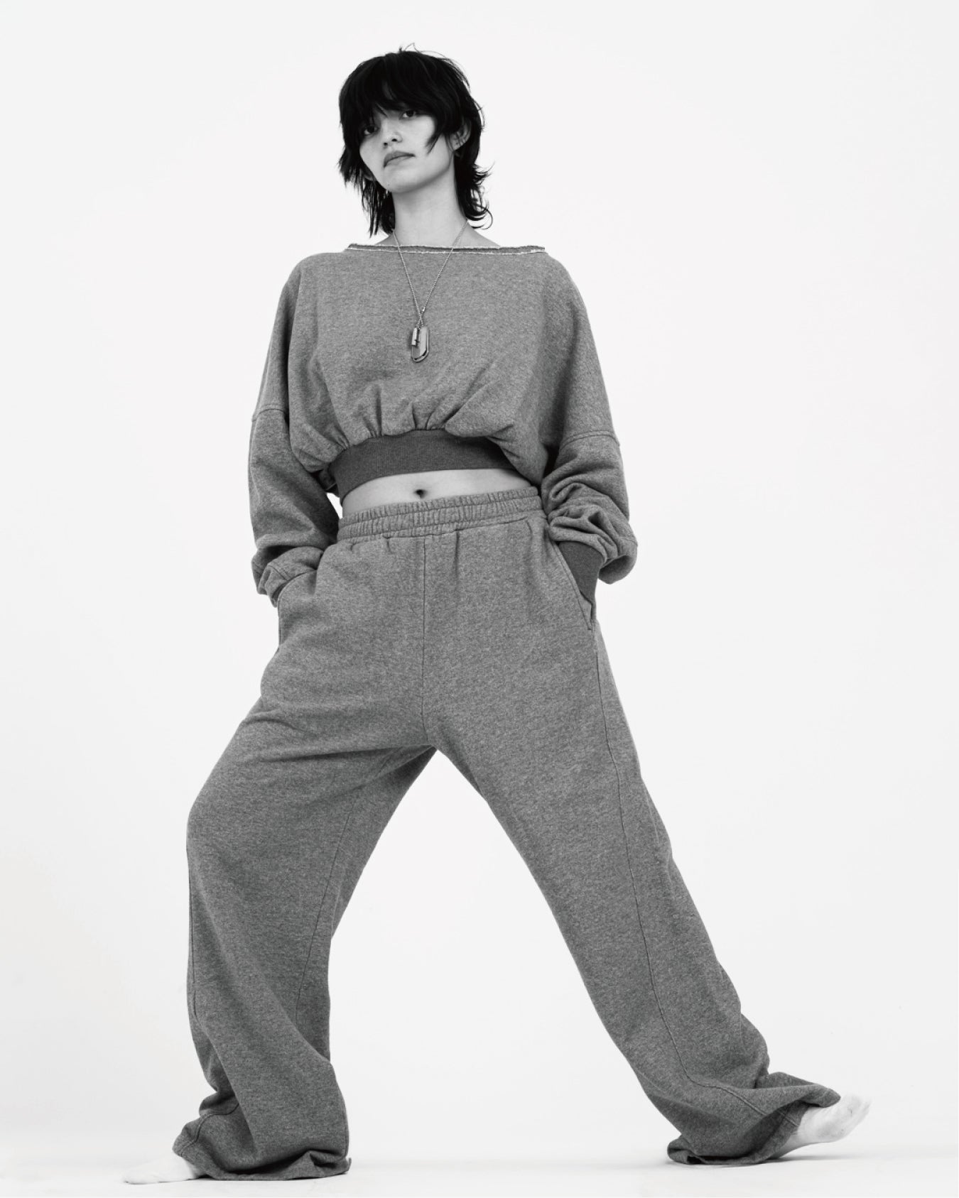 Our women’s signature premium sweatshirt made from 100% cotton features a voluminous silhouette with a cropped length. The raw-edge neckline is designed with an intentionally wide opening, giving the sweater a relaxed look. Traditionally worn as a boat neck design, this piece can also be styled as a one-shoulder sweatshirt by draping it over one shoulder. The voluminous long sleeves feature curved seam lines, adding a playful yet refined touch to the overall design. For a coordinated look, pair it with the French Terry Long Pants, or style it with your favorite jeans for a casual, everyday outfit.